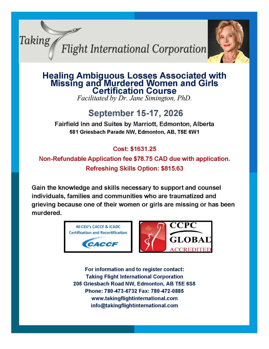 Dr. Simington will offer Healing Ambiguous Losses Associated with Missing and Murdered Women and Girls CertificationĀ course in your community for a minimum of 12 people. Please contact us for more information.Ā